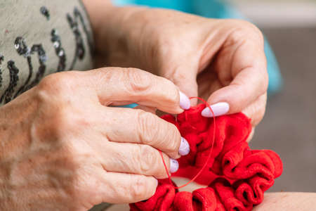 old female hands sew a red cloth up needle with a needle