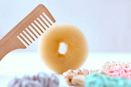 Wooden hairbrush, sponge and Lot of Colorful silk Scrunchies on white. Luxury Hairdressing tools and accessories. Hair Scrunchies, Elastic HairBands, Bobble Sports Scrunchie Hairband