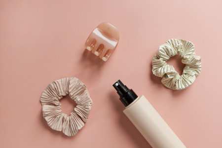 Hair spray and two scrunchies with hair pin on pink background-colorful hair tools and accessories