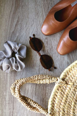Straw bag, vintage shoes, sunglasses and scrunchie on wooden background. Flat lay.