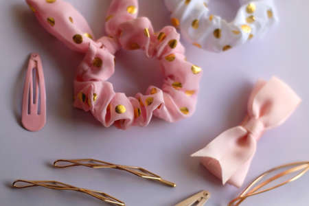 Various hair accessories in pastel and gold tones. Selective focus.