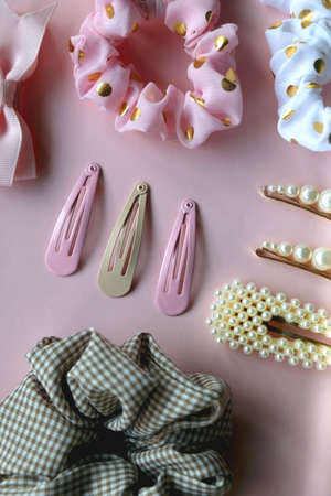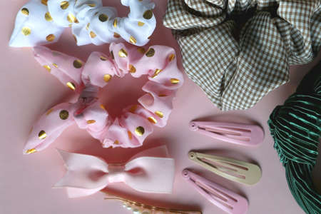 Colorful scrunchies, emerald green headband and pearl hair clips on pastel pink background. Flat lay.