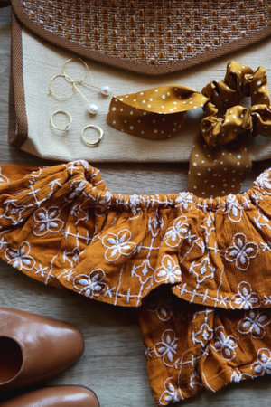 Denim skirt, ruffle top, wicker bag, brown shoes, round sunglasses, scrunchie and gold jewelry. Neutral and retro summer outfit. Top view, wooden background.