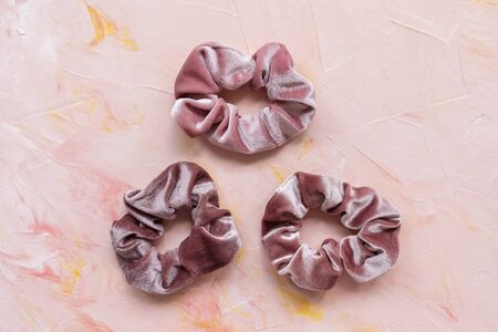 Three trendy velvet scrunchies on pink background. Diy accessories and hairstyles concept, copy space