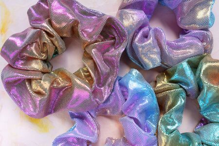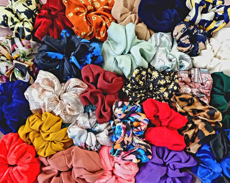 Colorful elastic rings. Girl elastic fashion band. hair scrunchy. A scrunchie is a fabric covered rubber band hair used to fasten long hair.