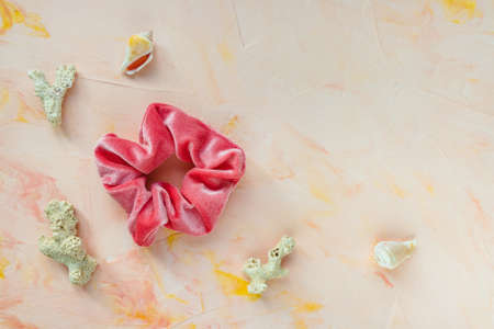 One trendy velvet scrunchie, sea shells and corals on pink backround. Flat lay, top view. Diy accessories, hairstyles, lifestyle, sea vacation and summer outfit ideas concept, copy space