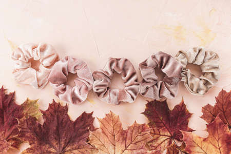 Pink and brown velvet scrunchies and autumn red and yellow maple leaves backround. Trendy accessories from 80s and 90s. Flatlay, top view. Hairstyle, outfit ideas for fall concept, copy space