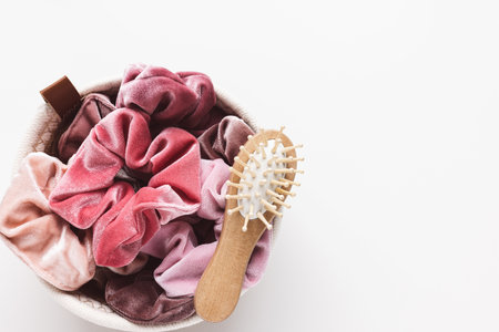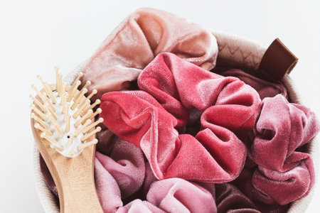 Pink velvet scrunchies and small wooden bamboo hair brush in basket for accessories on white background. Diy accessories, fashion trends and lifestyle concept. Closeup