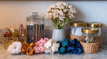 A beautifully arranged display of colorful hair accessories on a marble counter, featuring scrunchies in various shades alongside decorative storage jars and a floral accent.