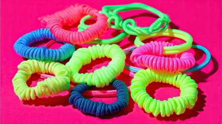 A vibrant display of colorful neon hair ties and elastic bands arranged on a bright pink background, showcasing playful textures and styles suitable for various hair types.