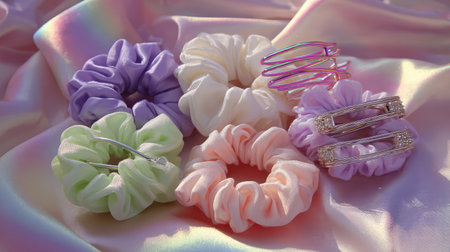 This image showcases a delightful collection of colorful scrunchies and stylish hair clips, set against a luminous satin fabric background, perfect for fashion lovers.