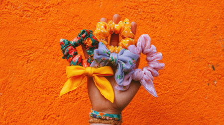A vibrant display of colorful hair accessories held in a hand against a bright orange background, perfect for showcasing fashion creativity and style.