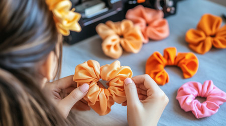 Woman making handmade scrunchies, sewing accessories with a sewing machine at her home workshop