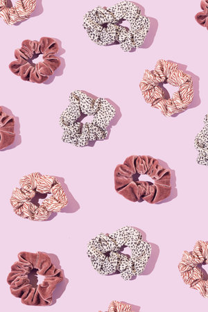 Creative pattern made of different hair rubber bands on pastel pink background. Minimal cosmetic products flat lay.