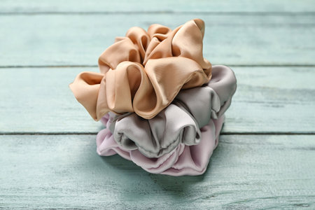 Stack of silk scrunchies on wooden background