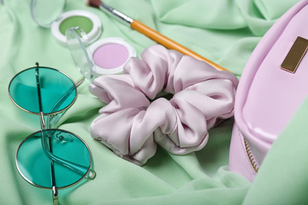 Stylish female accessories and scrunchies on color background