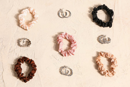 Set of stylish earrings and scrunchies on light background