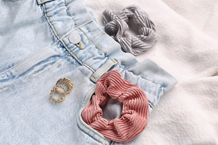 Silk scrunchy with jeans and rings on white fabric background, closeup