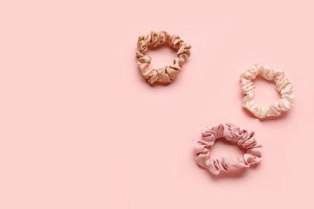 Set of silk scrunchies on pink background