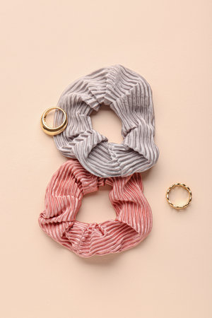 Stylish scrunchies and rings on color background