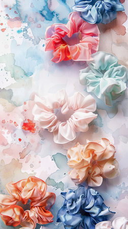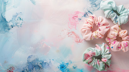 Colorful scrunchies on an artistic paint-splattered background. Concept of hair accessories, fashion, creative design. Vertical.