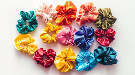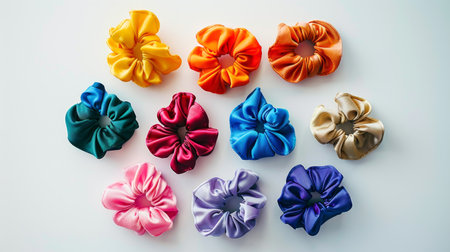 Colorful silk hair scrunchies on white background. Concept of fashion accessories, beauty products, hairstyle tools.