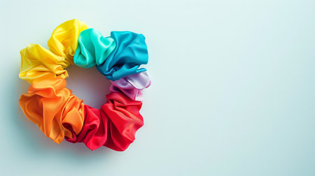 Colorful silk scrunchie on a white background. Concept of hair accessory, rainbow-themed fashion, bright colors, hairstyle decoration. Copy space.