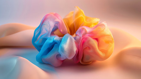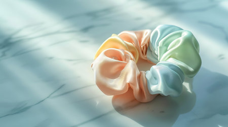 Colorful scrunchie with pastel hues on soft fabric background. Concept of hair accessory, fashion, beauty, style.