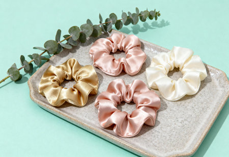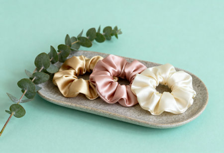 Elegant satin scrunchies in pastel colors displayed on ceramic tray with eucalyptus branch against mint green background.