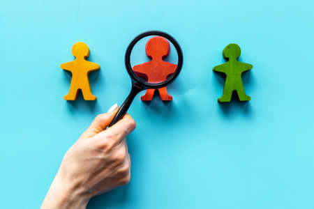 HR manager using magnifying glass to find human icons representing HR concepts like recruitment teamwork and leadership. Concept HR Concepts, Recruitment, Teamwork, Leadership, Human Icons