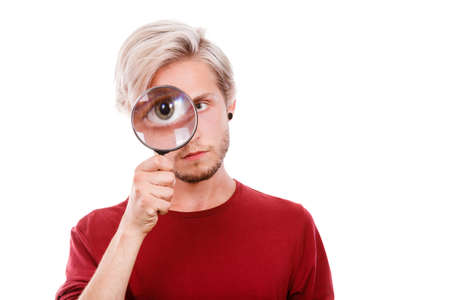 Investigation exploration education concept. Young guy holding on eye magnifying glass looking through loupe, isolated on white