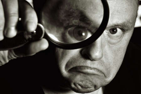 Businessman with magnifying glass, tax inspector doing financial auditing, retro toned, selective focus