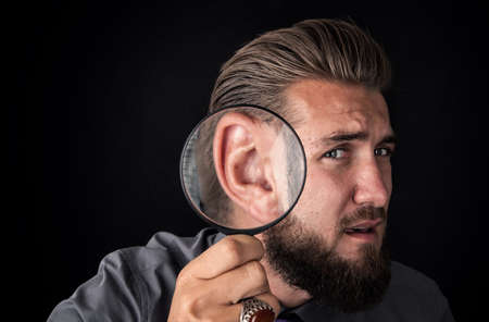 Close-up portrait of a young caucasian man peering through a magnifying glass, focusing intently, distorting his eye and face slightly.