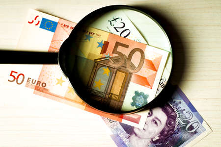 Checking a hundred dollar bill through a magnifying glass. Nearby fifty-euro bills. Close up.