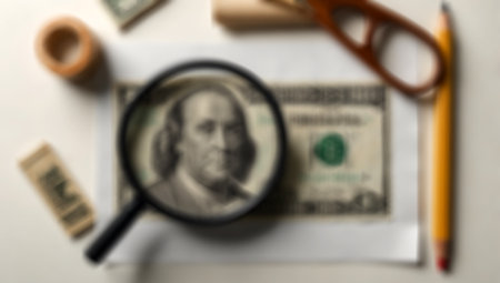 American banknotes under a magnifying glass on a gray background with a blank sheet of white paper.