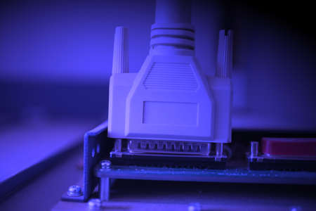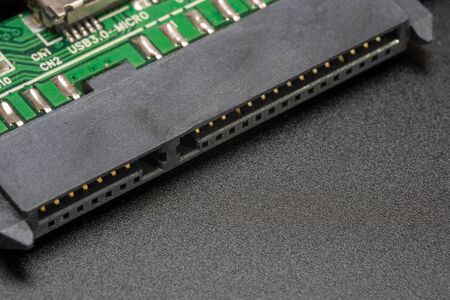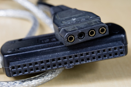 IDE and USB socket on a wooden workshop table. Computer connectors used in electronics. Dark background.