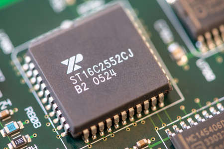 Timisoara, Romania - April 30, 2020: Close-up of an Exar ST16C2552CJ dual universal