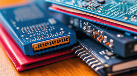 An electronic circuit board and various components are showcased, illuminated by a combination of red and blue light. The image highlights a complex arrangement of wires, panels, and equipment, indicating a possible laboratory or workshop setting. This composition may be suitable for illustrating technology, innovation, or research concepts in commercial contexts.