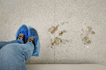 Legs in blue shoe covers top view. Shoe covers on boots and puddles of mud next to the floor. The concept of the obligation to put on shoe covers to prevent the spread of dirt in the room.