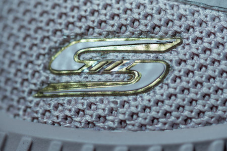 SKECHERS logo on the sneakers. Macro shot.