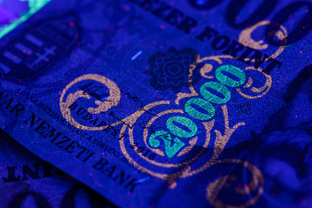HUF 20,000 Hungarian banknote in UV light. Fluorescent motives are clearly visible. Europe Hungary.
