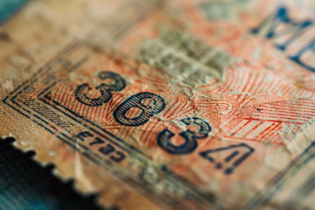A close up of a stamp with the number 3034 on it. The stamp is old and worn, with a faded blue and red design