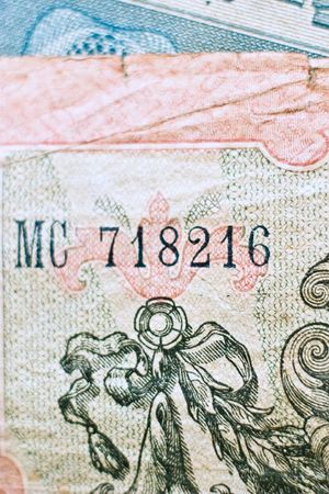 Selective focus on detail of LEI banknotes. Close up macro detail of Romanian LEI banknotes. World money concept, inflation and economy concept