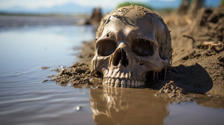 On a windswept beach, the sun's rays glint off a mysterious skull, half-buried in mud and surrounded by the otherworldly shapes of rocks and bones, evoking a feeling of both awe and trepidation