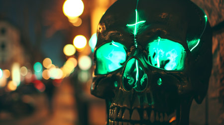 human skull with cross in eyes, glowing green wires on night light bokeh in city