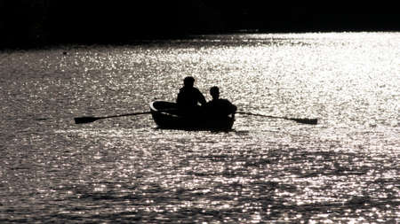 Two Man in a boat, rowing on the tranquil lake