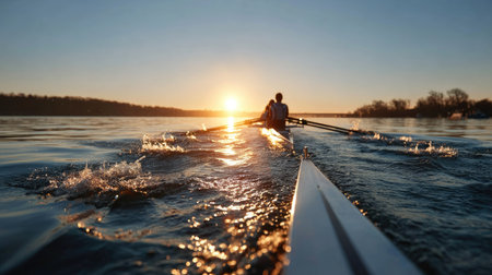 A group of rowers moves smoothly on a tranquil river as the sun rises, casting colorful reflections on the water.