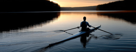 Rowing team silently paddling on a calm lake, their silhouettes visible against the vibrant orange sky and reflected sun during a beautiful sunset, symbolizing teamwork and effort