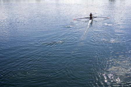 Sportsman single scull man rower rowing on boat.