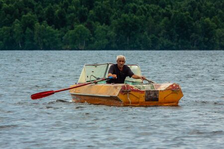 REPUBLIC OF KARELIA, RUSSIA - JULY 2, 2013: Old gray-haired tanned man sailing on boat with paddles on karelian lake.